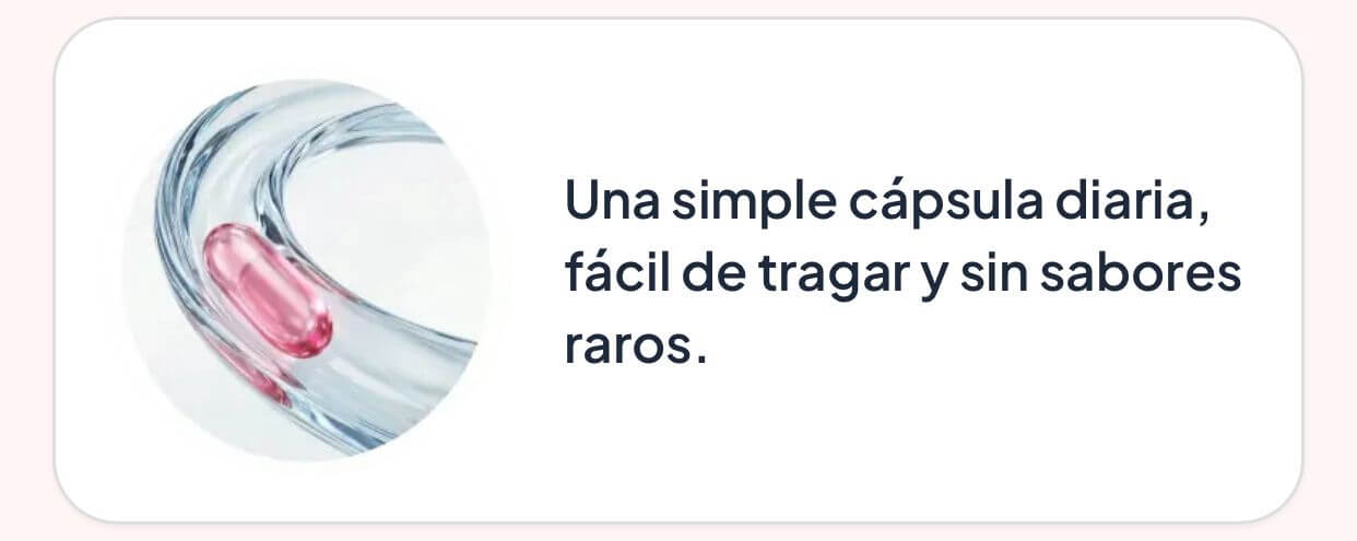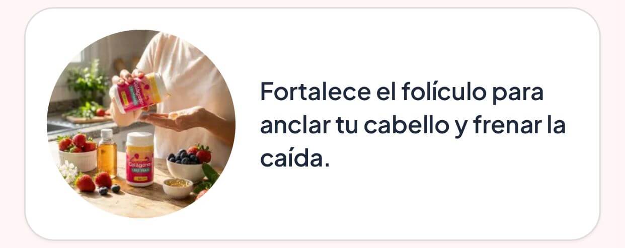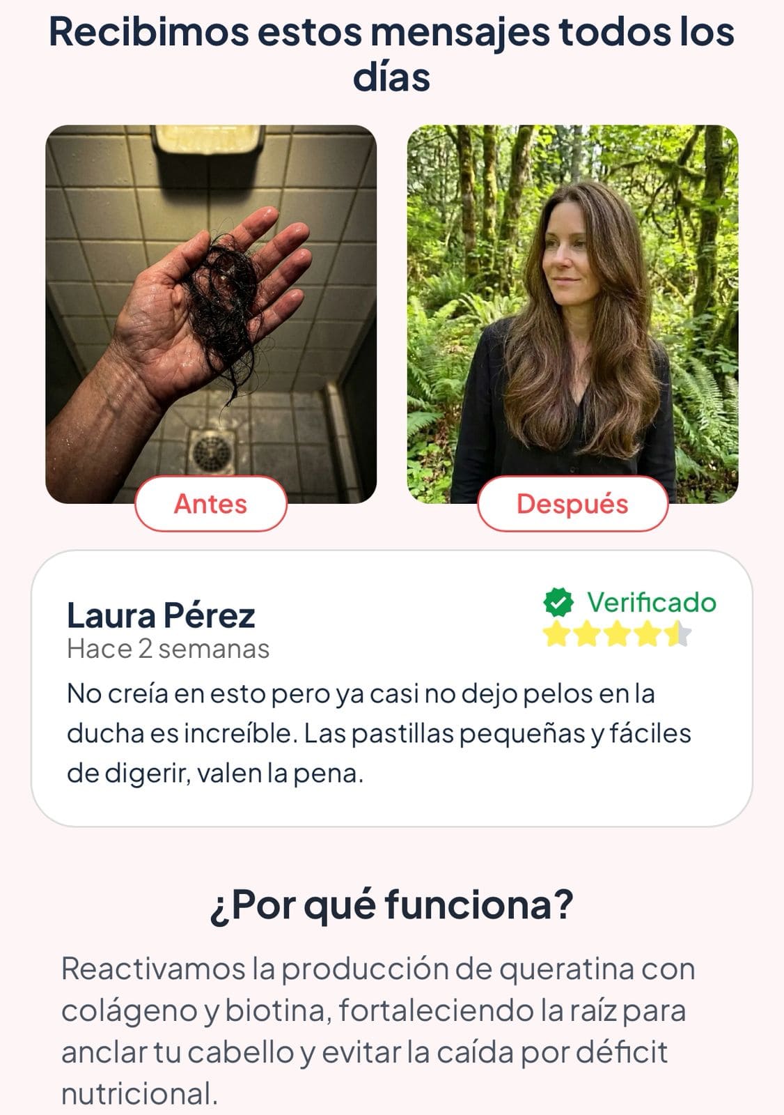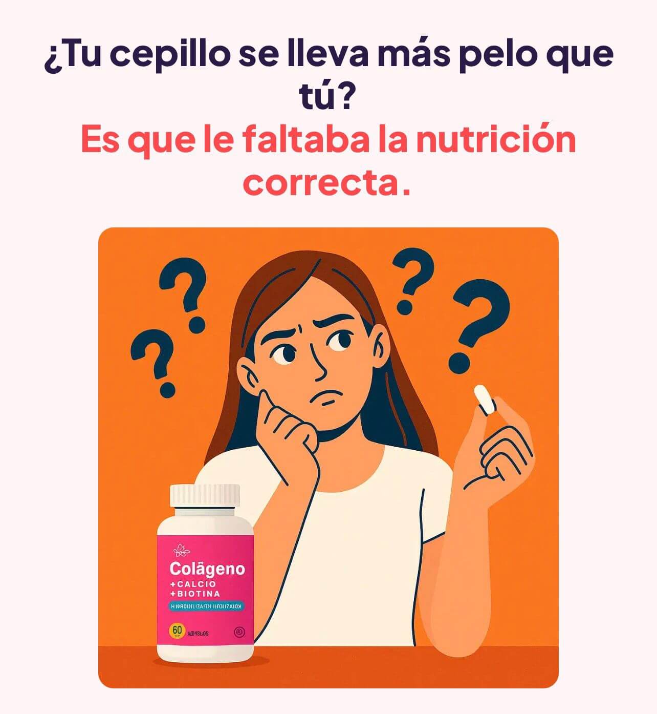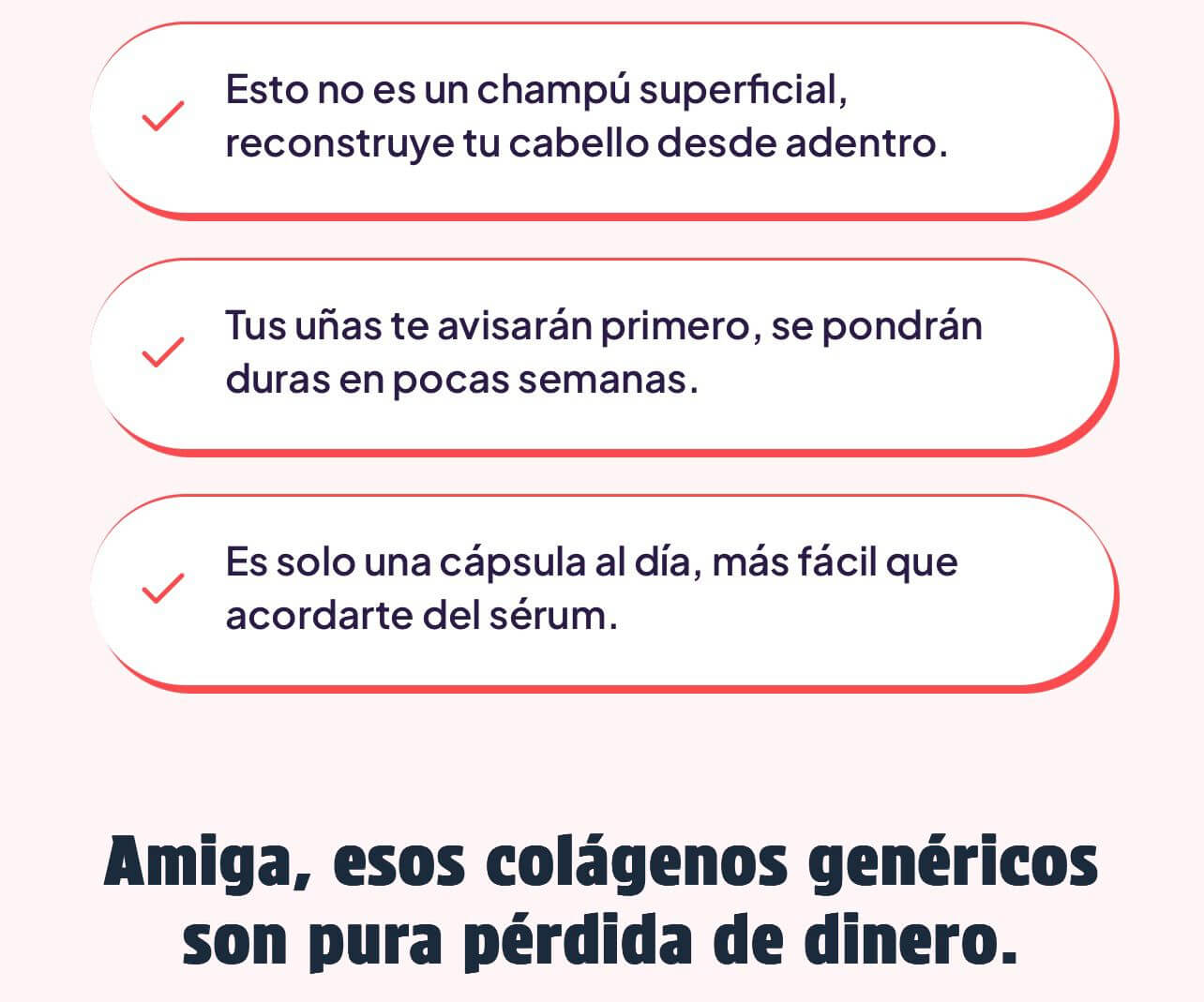 Porque actúa desde adentro, dándole a tu cuerpo los nutrientes que los champús no pueden. Ataca la raíz del problema.
